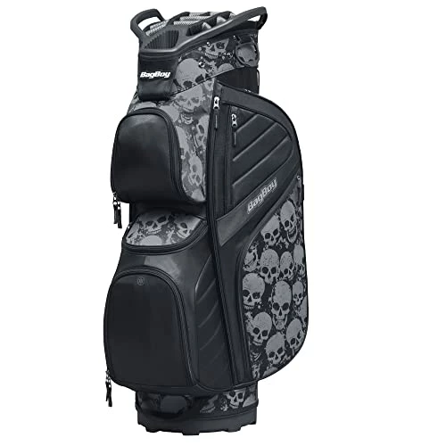 Bought this bag along with a Bag Boy push cart. This bag has the top lok system that is specific for Bag Boy push cart. Bag locks in and willNot rotate of move. No need for straps or anything. Bag has plenty of storage, full length dividers. Putter well is big and holds a super stroke grip.