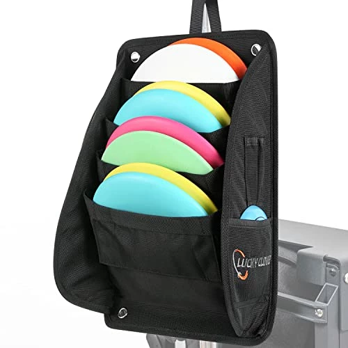 - CONVENIENT FOR EASY ACCESS: Add up to 8 discs to your cart with the easy-to-access disc putter pocket disc holder, allowing you to grab your favorite discs with ease! Each side has two pencil holders, a reinforced grommet hole for towels and bag tags, and a pocket for your scorecard, clipboard, or mini disc.top strap attaches to the cart handle so that you can control the height of the putter pouch.