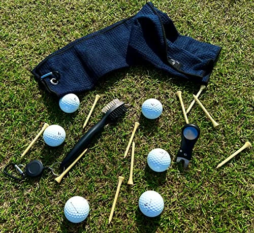 - FOR THE GAME AND THE GREENS: Other accessories in this bundle include a stainless steel foldable divot repair tool with a push button opening to care for the golf course as you play responsibly. This golf bag bundle also contains a two-sided retractable cleaning brush head with a firm wire brush for irons, strong but non-damaging synthetic bristles for woods, and a metal grove cleaner spike.