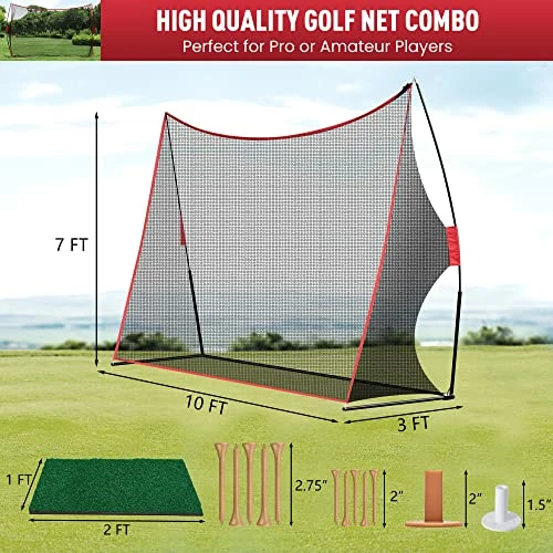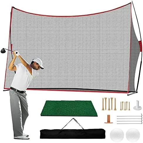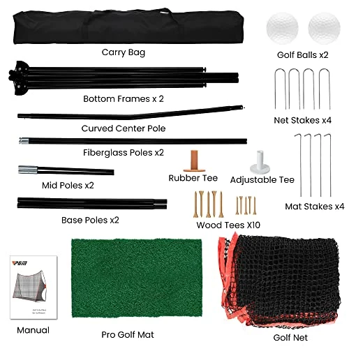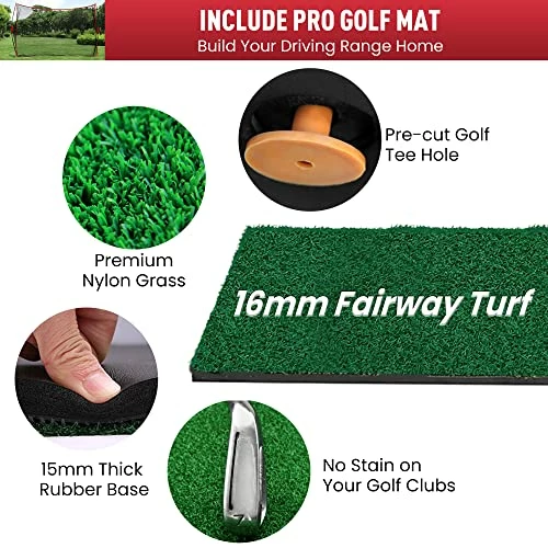 - Golf Net with Hitting Mat Set: Combo includes golf driving net, 1 pro golf mat, 2 golf balls, 12 golf tees and carry bag. The home golf net is perfect for pro or amateur players to improve skills both indoors or outdoors