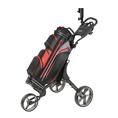 - LIGHTWEIGHT AND DURABLE DESIGN: The cart comes with strong and light aluminum frame which shows outstanding sturdiness and stability. It weighs only 13.6lbs, is very portable for both storage and transportation. It is equipped with upper and lower brackets with elastic straps which can coordinate with any size of golf bag.