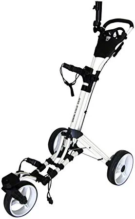 With easy-to-fold-and-unfold technology, the Qwik-Fold 360 Swivel 3 can be put up and put down in a lightning-fast one second. The ergonomically shaped handle is suitable for both right and left-handed golfers and the comfort grip is in it for the long haul. Attached to the handle is an umbrella holder to keep both you and your equipment dry during a downpour, and allows you to play in all weather conditions. Qwik-Fold golf push carts feature a scorecard holder with room for your tees, scorecard, and other game time necessities. A top and bottom bag holder keeps your bag in the correct position, complete with ultra-strong adjustable straps. The easy to use parking brake holds the golf club carrier in place just when you need itβ perfect for hilly courses. Smooth-running, stylish, and maintenance-free ball bearing wheels feature simple construction for maneuverability and compact storage. The quick-fold pull cart boasts rave reviews because of its ease of use. By far the fastest and easiest golf push cart around, all you need to do is push a button and the cart folds down into a compact size. To unfold, just pull up on the handle and the cart clicks into place.