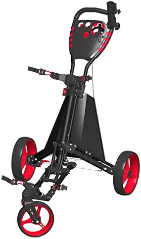 Simply put, this cart is fantastic! I was waffling back and forth trying to figure out what cart to get, what made each brand unique, what accessories I wanted not to mention what style or price I was willing to pay. Then I had to figure out if I wanted a 3 wheel, a 4 wheel or a 3 wheel swivel push cart and I am very glad that I chose the 3 wheel swivel Spin It Golf Products easy push cart. The best part about this cart is that is glides effortlessly on the grass with my bag easily secured. Turns on a dime (which sounds stupid but is actually really awesome on the course) with ease. The opening and closing of the cart is simple and very well built. Quality of the product is beyond my expectations, solid construction and design. The folding and latching process is seamless and the latching mechanism is 1 button simplicity at its finest. It’s light weight and easy to handle when folded and it takes up minimal space in my trunk. I can’t say enough good things! I would definitely purchase again without hesitation.There are other reviews out there that say the handle doesn’t stay up after engaging the handle clip. Mine did that when I first got it but all I had to do was spin the green handle clockwise 180 degrees (like you would to tighten a bolt) and, BOOMSHAKALAKA, it’s never failed since.You won’t regret this purchase.