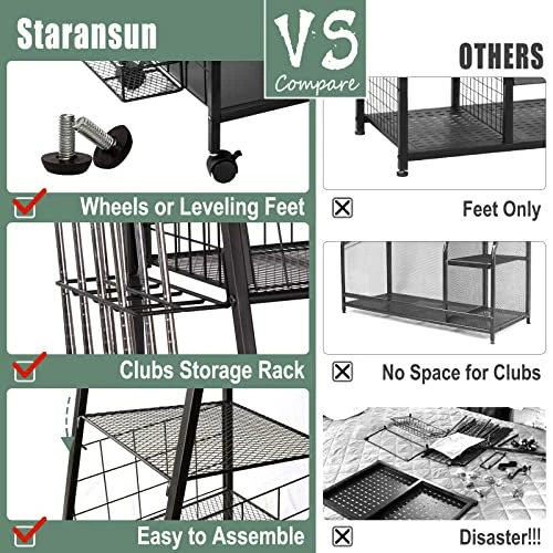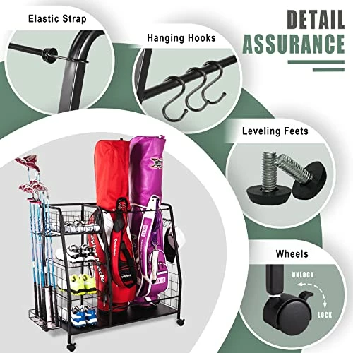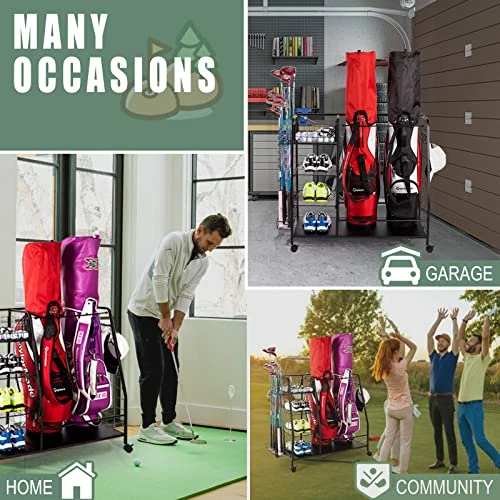 - γLarge CapacityγStaransun golf organizer features 2 standard golf bag spaces, 4 open shelves, 3 removable hooks, and extra side storage space for up to 8 golf clubs. All kinds of golf accessories can be put in this garage organization, making your place neat and tidy.