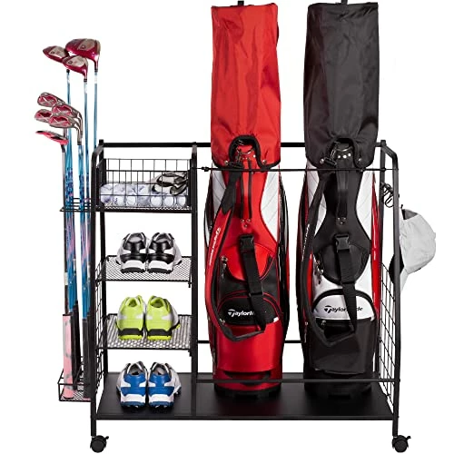 Love this golf storage rack which stores 2 golf sets easily and a lot of other gears and accessories. The assembly is also very easy and particular love the wheel base to move the rack around without any trouble. highly recommended set!