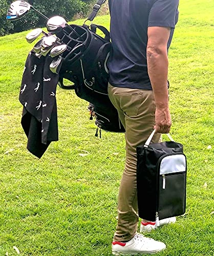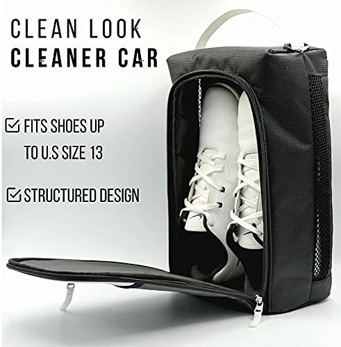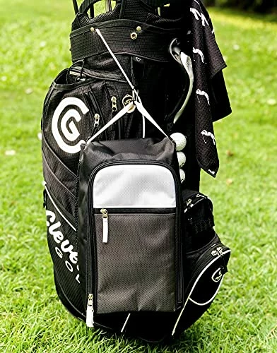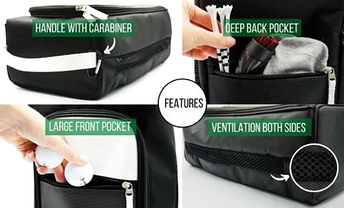 Key Features: Tear-resistant quality material (1680D Nylon)and inner-foam lining for structured and streamlined shape. Large pockets front and back to fit all your golf shoe accessories, as well as tees and balls. Full-length ventilation both sides and comes with a carabiner, so you can clip to your golf bag on the way to the clubhouse, and always keep one hand free.